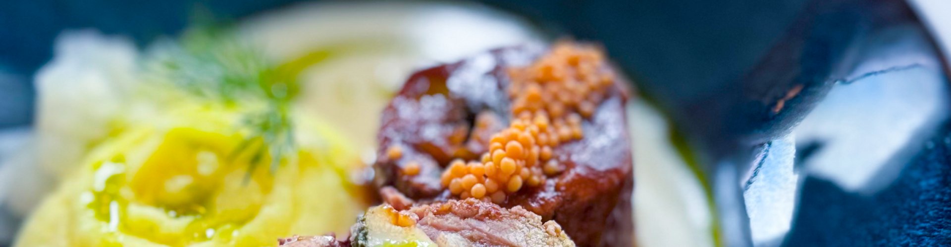 300 g Lamb roulade, kohlrabi cream, mashed potatoes, dill oil, marinated mustard seeds